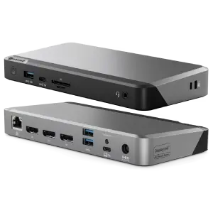 When linked to a computer using USB-C the DV4 dock can connect up to four* external displays via the 3x HDMI and 1x DisplayPort outputs for the ultimate in workstation display capabilities. This dock will also work with older laptops without USB-C, connecting via USB-A and allowing up to two displays to be used.